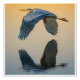 A graceful great blue heron glides over still water, its wide wings reflected in the calm surface below. This elegant wildlife photograph captures a moment of quiet motion and balance, bringing peaceful natural beauty to any space.