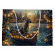 Set sail into the magic of the holiday season with this beautifully detailed illustration, showcasing a proud dog sitting in a festively decorated boat, gliding across a serene Christmas lake. The twinkling lights from nearby pine trees reflect off the water, casting a warm, festive glow that enhances the cosy ambiance. Ornaments dangle from the boat's sides, while glowing lanterns light the way, creating a scene that captures the true essence of Christmas warmth and joy. This nostalgic artwork brings a touch of holiday magic to any space, perfect for those who cherish the spirit of the season.