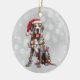 On the front of this Holiday ornament is an image of a Great Dane Dog wearing a Santa hat and wrapped in coloured Christmas lights. The image is set against a festive silver bokeh background. The back of the ornament has the same background with custom text that currently says "Merry Christmas Happy New Year", the date and your signature. Cute for anyone, but especially for Great Dane fans.