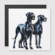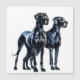 A stylised illustration of two majestic Great Danes standing side by side, showcasing their sleek, muscular bodies and elegant features. The dogs are black with smooth, glossy coats, accentuated by dramatic shadows and highlights to emphasize their strong physiques with a subtle watercolor effect adding an artistic touch.