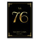 Great Gatsby Art Deco wedding table number cards with golden number 76 and changeable text, where you can add your names and wedding date, printed on black background