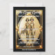 An ornate faux gold vintage art deco style frame has a golden oval inlay on which white templates for your personalised wording appear. Flapper girls with short brown hair are wearing long figure hugging faux gold foil satin dresses and caps that appear to shimmer and shine with radiance. They are framed by an elegant and intricate art nouveau retro style frame reminiscent of the twenties era. The design is suited to 1920's theme parties; art deco themed celebrations or Great Gatsby bridal party and corporate events. They are perfect for both business and personal use. The back has the same graphic with a template for your heading or additional information.