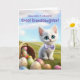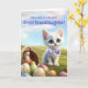 Happy Easter card for a great-granddaughter featuring an adorable, sweet-eyed, fluffy white kitten beside a basket brimming with colorful eggs.