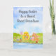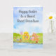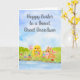 Bright spring colors and playful charm fill this watercolor Easter card, featuring a fluffy baby chick carrying a basket of colorful Easter eggs while a friendly bunny wearing a pink bowtie keeps watch nearby. Set among blooming pastel tulips, the scene captures the excitement and fresh spirit of the season. Thoughtfully created as a special Easter greeting for your great grandson, this cheerful design sends warm wishes, smiles, and joyful holiday fun.