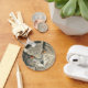 A colour pencil and ink drawing of a Great Horned Owl with piercing orange eyes adorns this keychain!