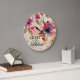 Wall clock depicts a beautiful floral watercolor including elegant pink and lavender flowers and greenery on a light gold background. It features the beloved Christian Hymn, "Great is Thy Faithfulness."