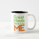A coffee mug featuring the funny phrase "Great Minds Think Like ME" in green and orange letters.