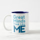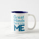 A coffee mug featuring the funny phrase "Great Minds Think Like ME" in blue letters.