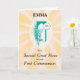Congratulate your special great niece as she makes her First Holy Communion. This card celebrates with a golden sun burst with a chalice, host and wheat in the centre in teal colour. Customise with her name for a truly personal keepsake on this holy day.