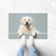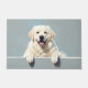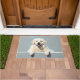 The soft icy gray-blue background enhances its snowy coat, creating a clean and serene look perfect for welcoming entryways. Designed with extra space at the top and bottom, it allows easy personalization with names, welcome messages, or custom text—making it ideal for unique dog-themed doormats and thoughtful gifts.