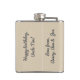 The flask itself is fine. It’s a cheap flask, obviously bought in bulk, however am prepared to overlook that. Given that it is a personalized item, I would have liked to have seen gift boxing instead of the generic packaging. Terrible printing, and/or quality. It’s a cheap, tacky vinyl. It is not cut straight and is also applied in a way that it is overhanging the bottom, causing the glue to catch on items and it will eventually roll and tear, damaging the wrap.