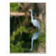 A Great White Egret standing in a shallow river stalking a fish. The reflection of the bird is seen in the still calm waters.