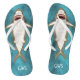 These custom flip flops have a hand-drawn shark with plenty of pointy teeth, swimming along on a blue / sea green ocean background with bubbles and the silhouettes of fish trying to escape. Use the easy template to add your monogram.