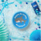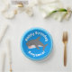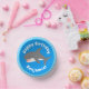 A happy, hungry great white shark is swimming in the ocean. Drawn in cute cartoon illustration style on a blue background for a fun celebration!