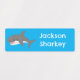 A happy, hungry great white shark is swimming in the ocean. Drawn in cute cartoon illustration style on a blue background for a fun day!