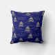 Fun surfer cushion patterned front and back with a pattern of cute great white sharks and waves over navy blue
