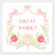 The classroom crest stickers have a crest with pink bows, a stack of school books, apples and pencils. Colours include, Pink, red, blue, yellow, green and black. Text says "great work!!"