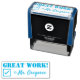 This fun rubber stamp design features the inspiring message "GREAT WORK!" and a customised teacher's name. It also features a decorative checkmark. It could be used by a teacher, educator, or tutor when marking assignments, to indicate that a student has done well.