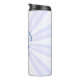Thermal tumbler featuring the blue and white Flag of Greece in a heart shape makes the O in the blue lettered word LOVE. Below it reads OXI DAY 20??. You can customise it to say anything you like. Perhaps, FAMILY REUNION 2030 or EASTER 2031? Above, a spot for your family name or any name you wish for added personalisation. The word LOVE sits in the centre of a digital art created white, fractal of radiating streaks. Fun gift. Great to take to a Greek family reunion.