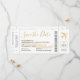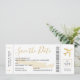 Boarding Pass Plane Ticket Save the Date Invitation Card for a Destination Wedding in Crete, Greece, featuring a romantic aeroplane icon and faded gold island map background with modern elegant script fonts and back side with travel and accommodations information for guests to start planning their trip to celebrate your marriage in the middle of a vacation.