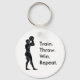 A round key chain with a graphic of a basketball player preparing to throw a ball in Greek Art style with the words "Train. Throw. Win. Repeat." Definitely the universal winning formula for any sportsman.