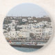 Greek Island Port with boats and white homes on a hillside, Greece round Stone coaster