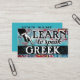 Colourful arty Learn To Speak Greek business cards in turquoise, aqua, red, yellow. Greek language Instruction business cards.