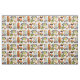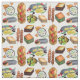 Fabric features an original illustration of an assortment of Greek and Mediterranean foods, including: tzatziki with pita chips, gyro, fresh grilled fish, tsoureki Easter bread, olives, moussaka, baklava, spanakopita, and souvlaki pork skewers.