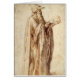 Philosopher (c. 1495-1500) by Michelangelo (1475–1564) is a vintage Renaissance Era fine art portrait painting. A portraiture sketch by Michelangelo in pen and brown ink of a scholar, a deep thinker lost in thought. A study drawing featuring a professor, an old man with a long beard wearing a hat and robe and holding a human skull thinking.