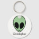 A fun key chain featuring a green alien head with big black oval eyes and a small black slit for a mouth. Below is a template to allow you to add your own name to personalise.
