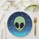 A green alien head with big black oval eyes and a small black slit for a mouth. The background is a dark to light blue gradient colour dotted with white stars.