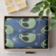 A green alien head pattern with big black oval eyes and a small black slit for a mouth. The background is a dark to light blue gradient colour dotted with white stars.