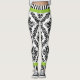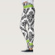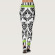 Black and white damask pattern and stripes leggings. A cute retro black and white damask pattern, a green band and black and white stripes on the top and bottom adorn this cool pair of leggings.