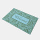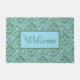 Pretty foliage doormat in green and light blue. This features a delicate trailing leaf design. The background is leaf green and the leaves are sky blue. In the centre is a rectangle with Welcome in a curvy French font. But you can change this to say what you like.