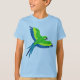 Tee in an illustration of an emerald green and cobalt blue macaw / parrot in flight