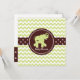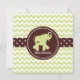 Stylish couple's baby shower invitation done in a square shape and a pale green and white trendy chevron zigzag pattern, on the front. Graphics of a brown and white polka dot band, runs across the middle of the invitation, with a brown decorative disc, with a green and white polka dot elephant, in the middle. The back of the invitation is done in white, with a brown and white polka dot band, across the bottom with three cute green polka dot elephants. Personalise the brown and green text for your baby event. Cute invitation the new parents to be will cherish.