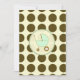 An invitation featuring a brown polka dot background over warm beige with light green trim. Personalise the brown text with details of your event. Opposite side is solid polka dot with a green baby carriage inside a matching circle shaped frame.
