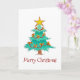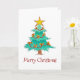 A holly jolly Christmas card featuring an illustration of a colourful Christmas tree decked with red garlands and golden bulbs. "Merry Christmas" message dances beneath in cheerful letters. Blank on the inside.
