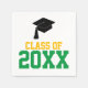 Decorate your party table with these Green and Gold Class of 2024 Graduation Party Napkin. Personalise with your graduate's class year. It features 'Class of 20xx' in gold and green with a black grad cap.