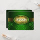 Green and gold graduation invitation with light and dark green stripes and a gold ribbon going across showing the year of graduation. The back of the card is green with light gold font for people to fill in the graduation announcements.