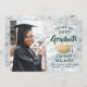 Announce a high school or college graduation and invite family and friends to celebrate with custom photo faux marble party invitations. The picture and wording are simple to personalise and the colours are easy to change with the Zazzle design tool. This template is set up as a combination announcement card and party invitation that can be customised with any details of your choice, such as parents' names, special honours, degree title, favourite inspirational quote, graduate's future plans or new address. The green, gold and white design features a faux marble background, a faux foil mortar board cap, elegant modern calligraphy, classic vintage typography and one favourite photo, such as a senior picture or an image from the commencement ceremony. Please note that gold is printed colour, not metallic foil. This graduation card is a stylish way to announce a special day celebration. Congratulations to the graduate!