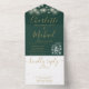 All in one wedding invitation featuring pretty string lights, mason jars, elegant gold signature script name and monogram initials on an emerald green background. The invitation includes a perforated RSVP card that can be individually addressed or left blank for you to handwrite your guest's address details. Designed by Thisisnotme©