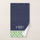 This custom made-to-order bath towel set has a chic modern trellis pattern in navy blue, green and white. Personalise it with a classic 3 letter monogram or other custom text. Use the design tools to choose any background colours, edit the text fonts and colours or upload your own photos to create a unique custom set of bath towels to match any bathroom decor. The set includes a coordinating bath towel, hand towel and wash cloth or select individual towel sizes as needed.