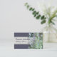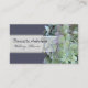 Green hydrangea and purple business card template. Green flowers bloom at the side of this medium size elegant, floral card with a dark purple background and matching text on the front. A white "ribbon" holds lines for name and title on the front, with 4 more lines of text to customise on reverse. You may upgrade the paper type in the box to the right.
