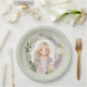This pretty design features a whimsical illustration of Rapunzel surrounded by pale green and purple flowers.