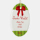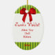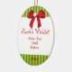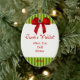 A great ornament for remembering what the little ones wished for Christmases past. It features green stripes on the top and bottom. A graphic of a red ribbon sits at the top. The centre is white with red text. You customise your little one's gift list on it.