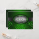 Green and silver graduation invitation with light and dark green stripes and a silver ribbon going across showing the year of graduation. The back of the card is green with light silver font for people to fill in the graduation announcements.
