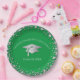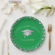 This modern design features a graduation hat and confetti in silver on a background of green with white text.