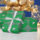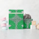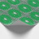 This modern design features a graduation hat and confetti in silver on a background of green with white text.