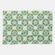 Decorative geometric flower pattern in shades of green on a light teal background.
